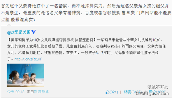 其二,在美国要剥夺亲生父母的养育权是一个难度很大且非常严格的法律过程,仅凭父亲给女儿洗澡这一条法庭就剥夺父亲的监护权是根本不可能的,这一点我专门给美国相关律师打了电话并得到了证实。